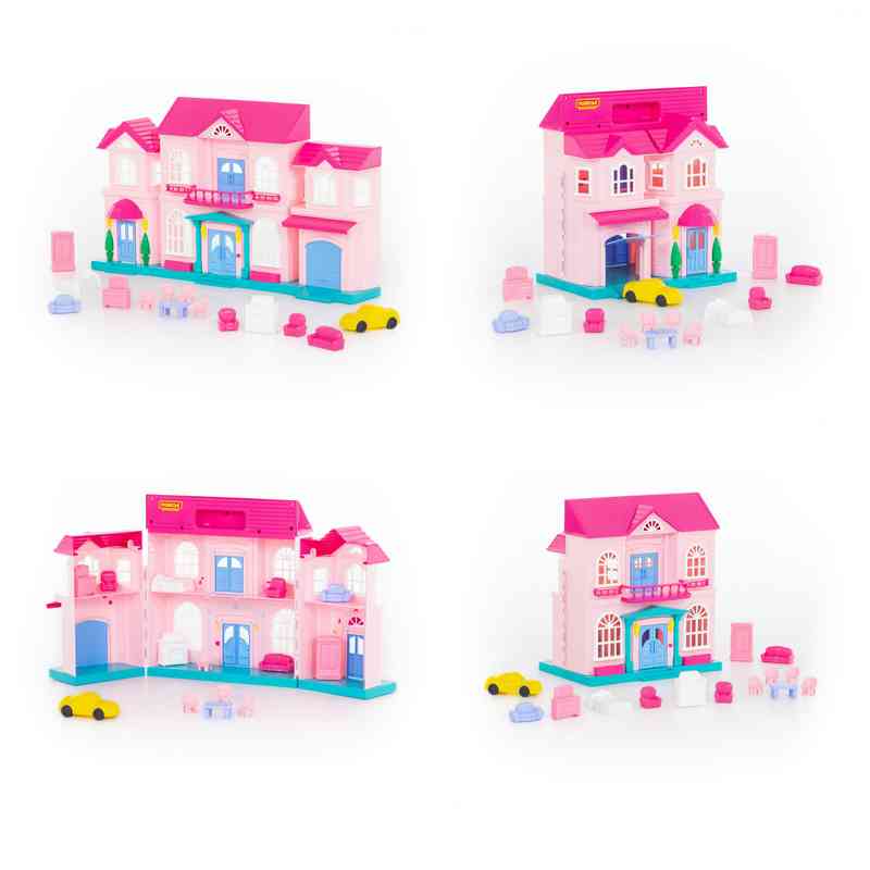 Домик имеет 2 этажа и предполагает несколько зон для игры с куклами. Разнообразит игру и сделает её ещё интереснее наличие дополнительных аксессуаров.