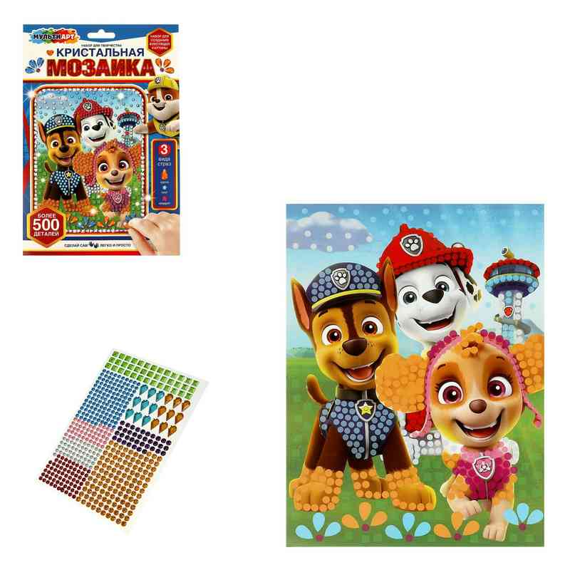 При помощи этого набора маленький художник сможет создать блестящую картину с изображением очаровательных щенков-спасателей, декорированную сверкающими стразами. Готовая поделка станет отличным вариантом для подарка близким или для украшения интерьера детской комнаты.