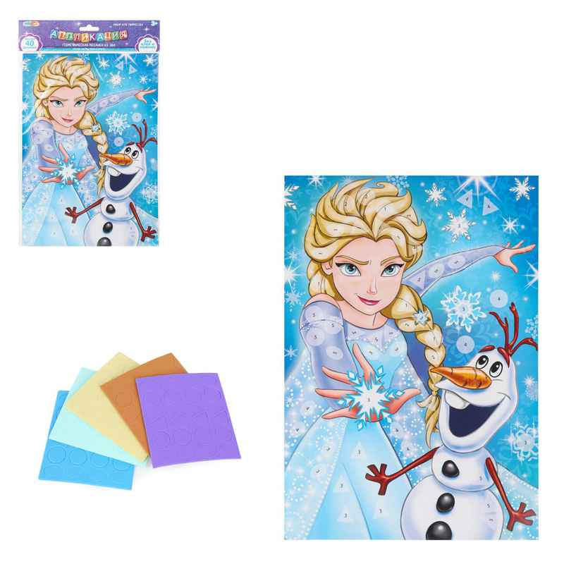 С помощью красочной картонной основы и разноцветных мягких элементов юная художница сможет самостоятельно создать необычную аппликацию с изображением принцессы-волшебницы и её друга-снеговичка. Готовую поделку можно подарить близким или использовать для украшения интерьера.